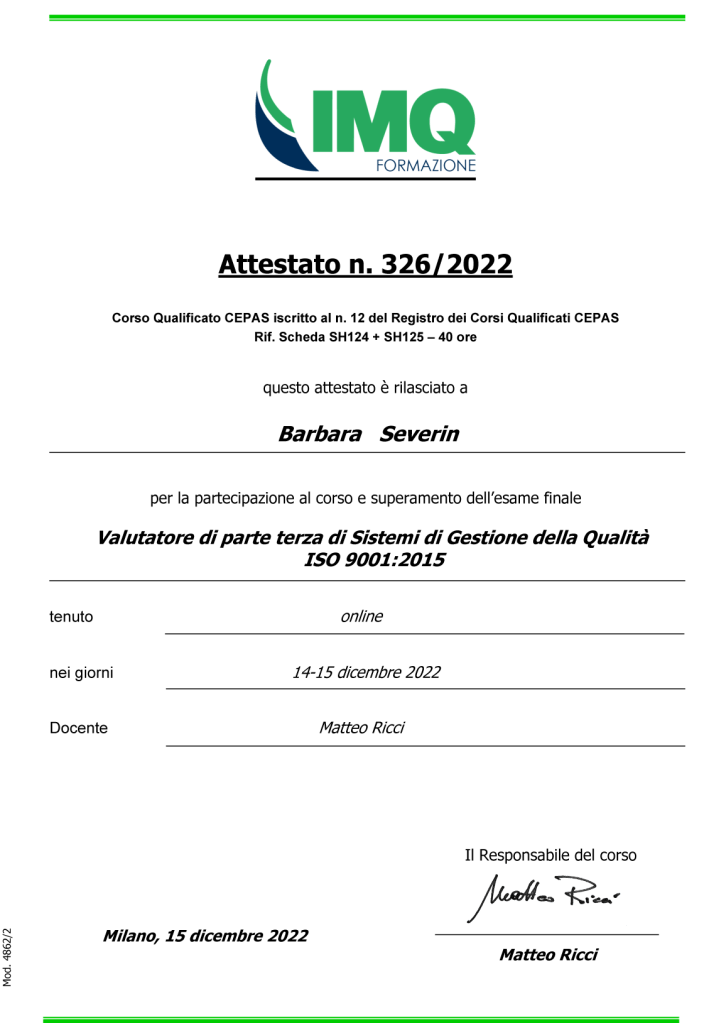 - UNI EN ISO 45001 Sistemi di Gestione per la Sicurezza
